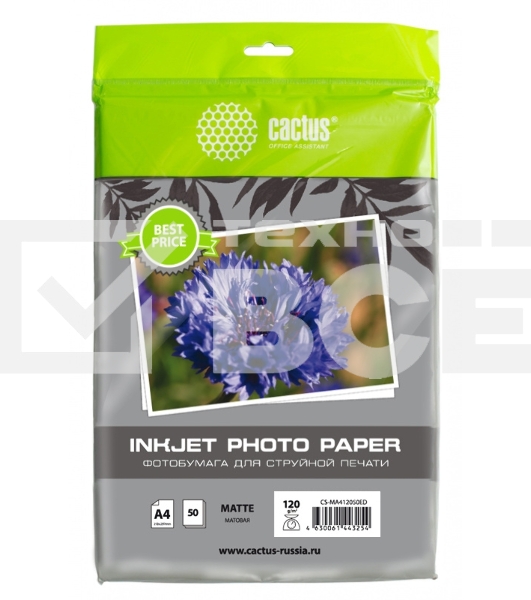 Фотобумага Cactus CS-MA412050ED A4/120г/м2/50л./белый матовое для струйной печатиАртикул: 9990156