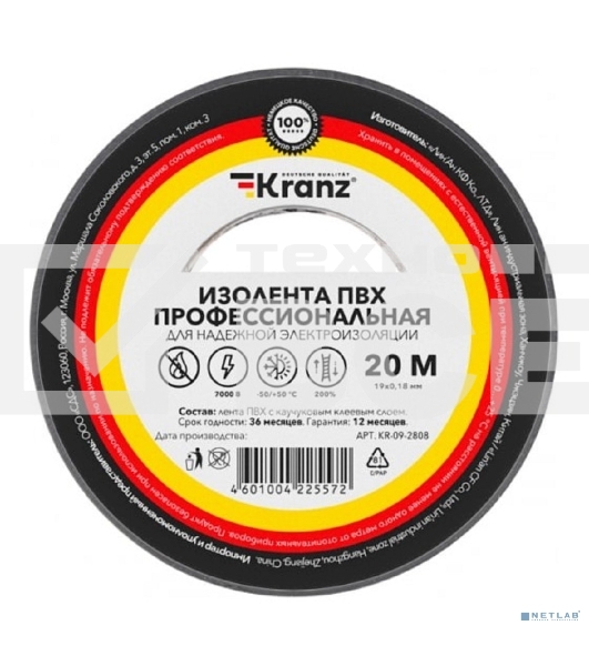 Изолента ПВХ Kranz профессиональная, 0.18х19 мм, 20 м, серая (10 шт./уп.)Артикул: 10361534